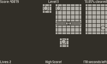 Score points for successfully building walls. The larger the area covered in a single go, the more points! Get bonus points at the end of a successfully completed level for lives left, time left, and extra area cleared!